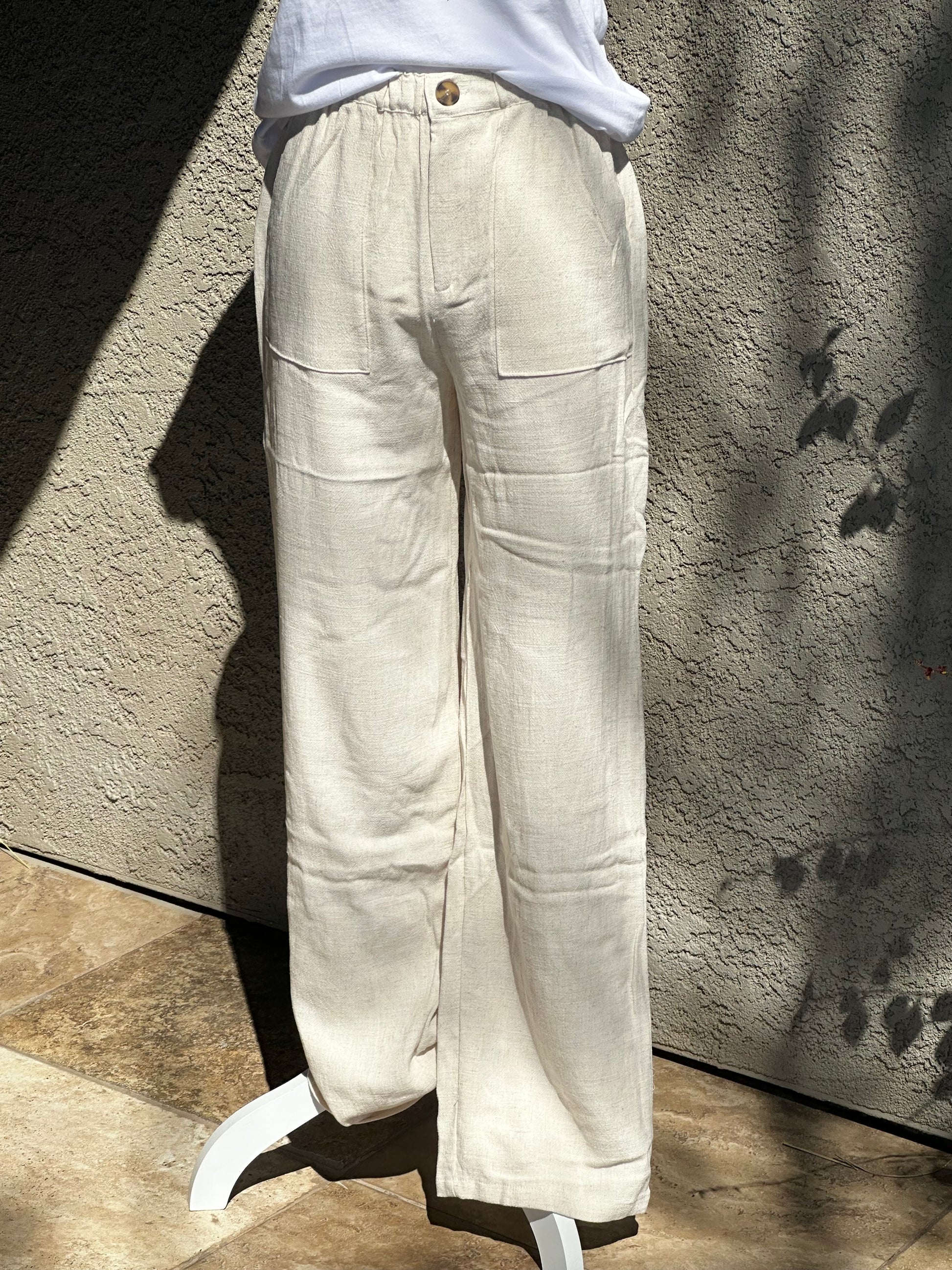 These Pearly Linen Pants provide a breezy and lightweight option for casual spring wear. Made with linen fabric, they offer a comfortable and relaxed fit. Perfect for any warm weather occasion, these pants are a must-have addition to your wardrobe.