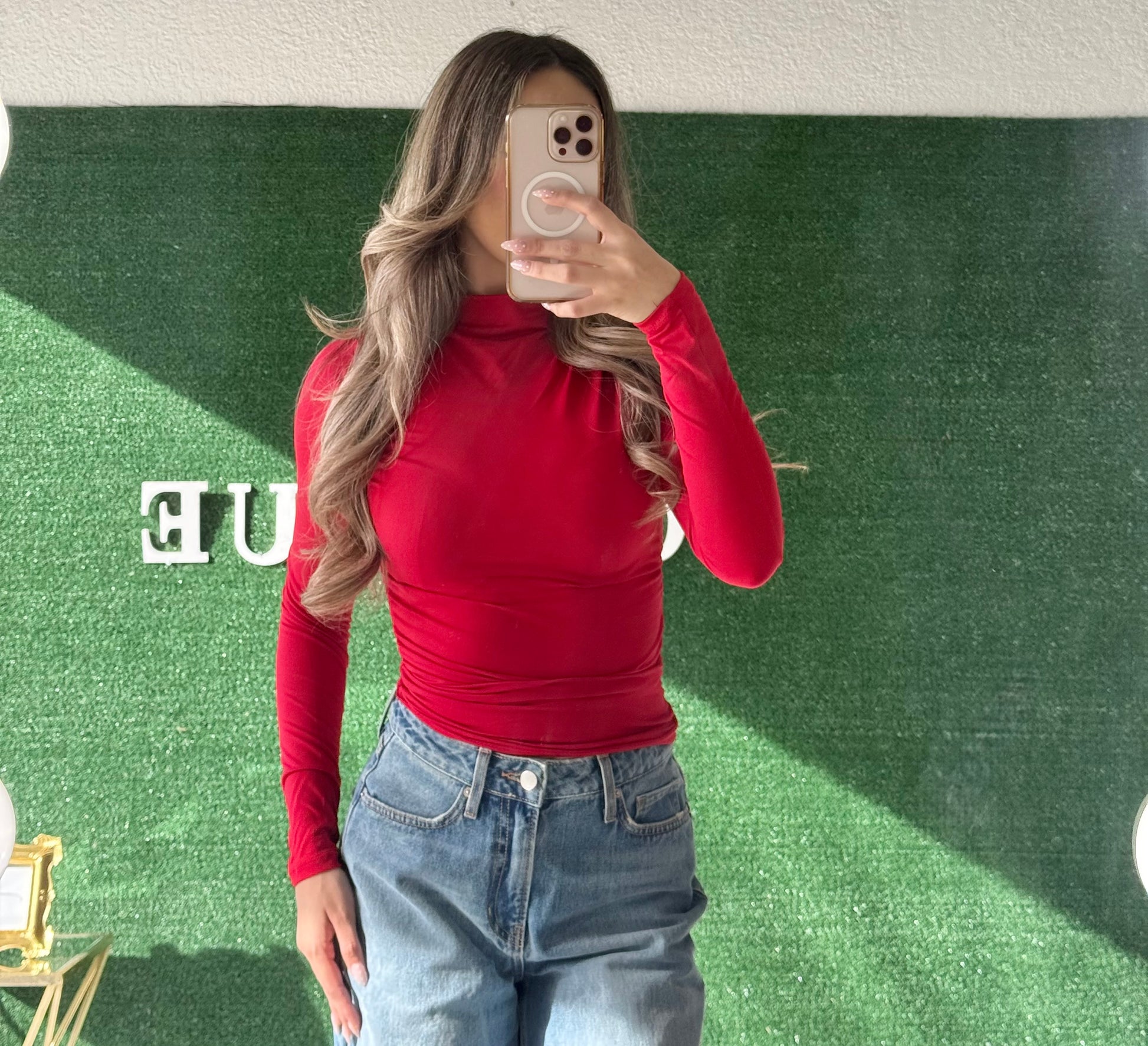 Mock neckline, long sleeve, a body-hugging silhouette, ruching details, and waist length