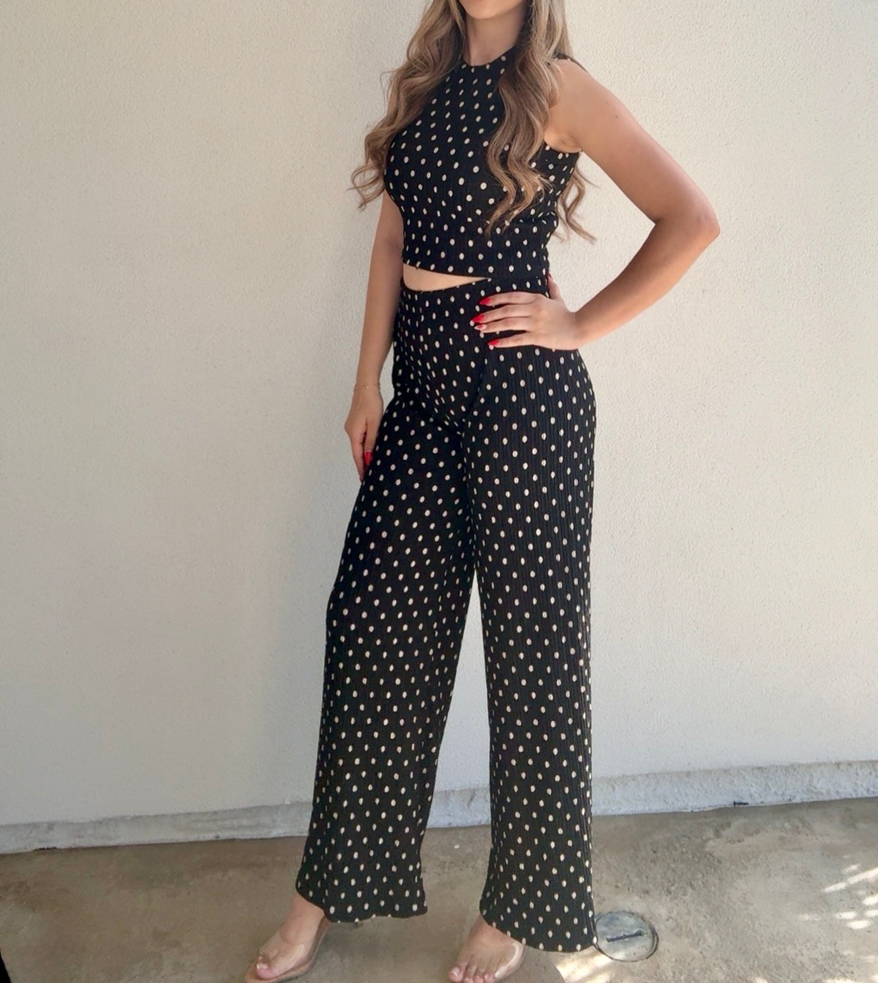 Crinkled texture, sleeveless cropped top, wide leg pants and polka dot